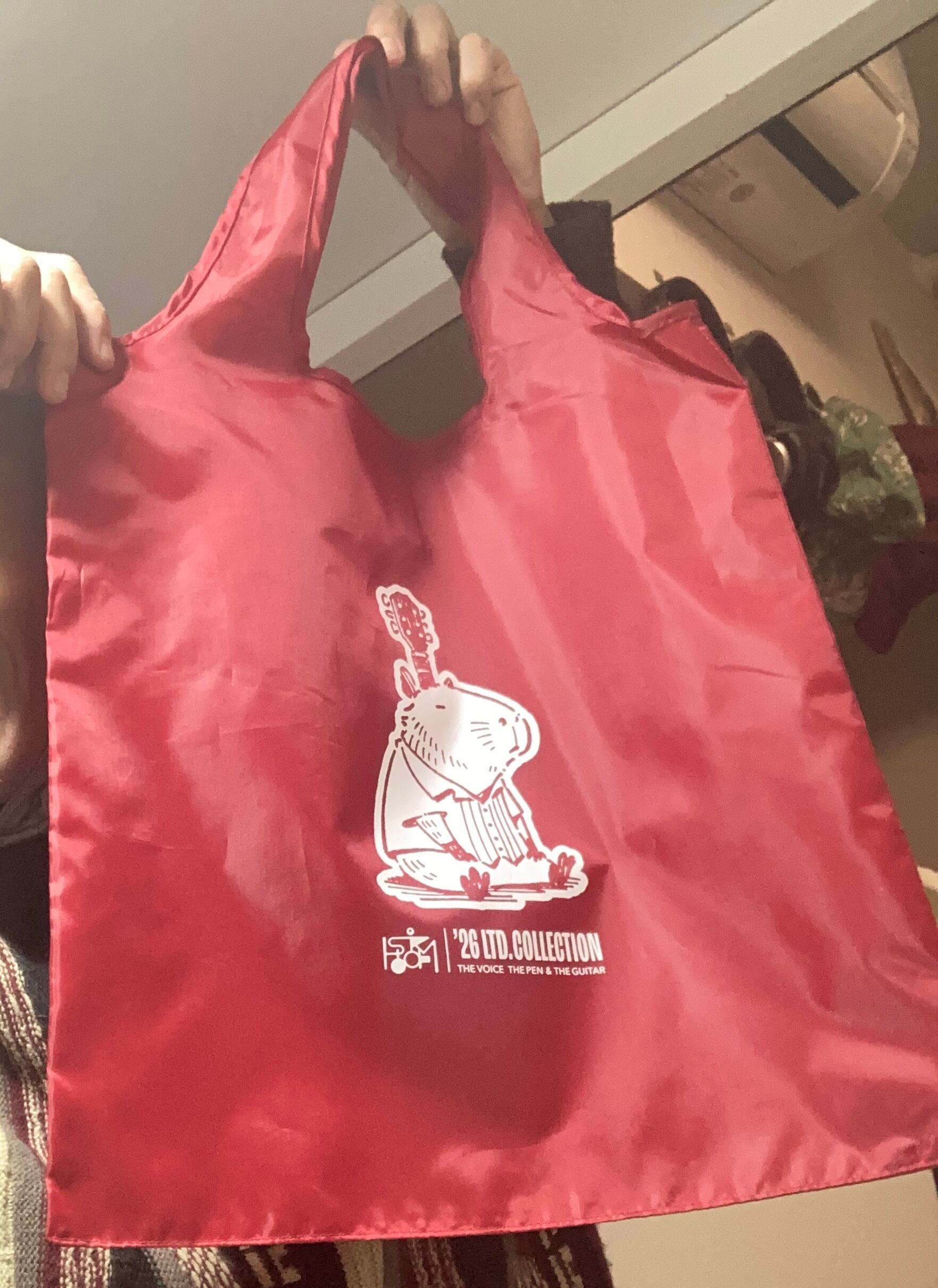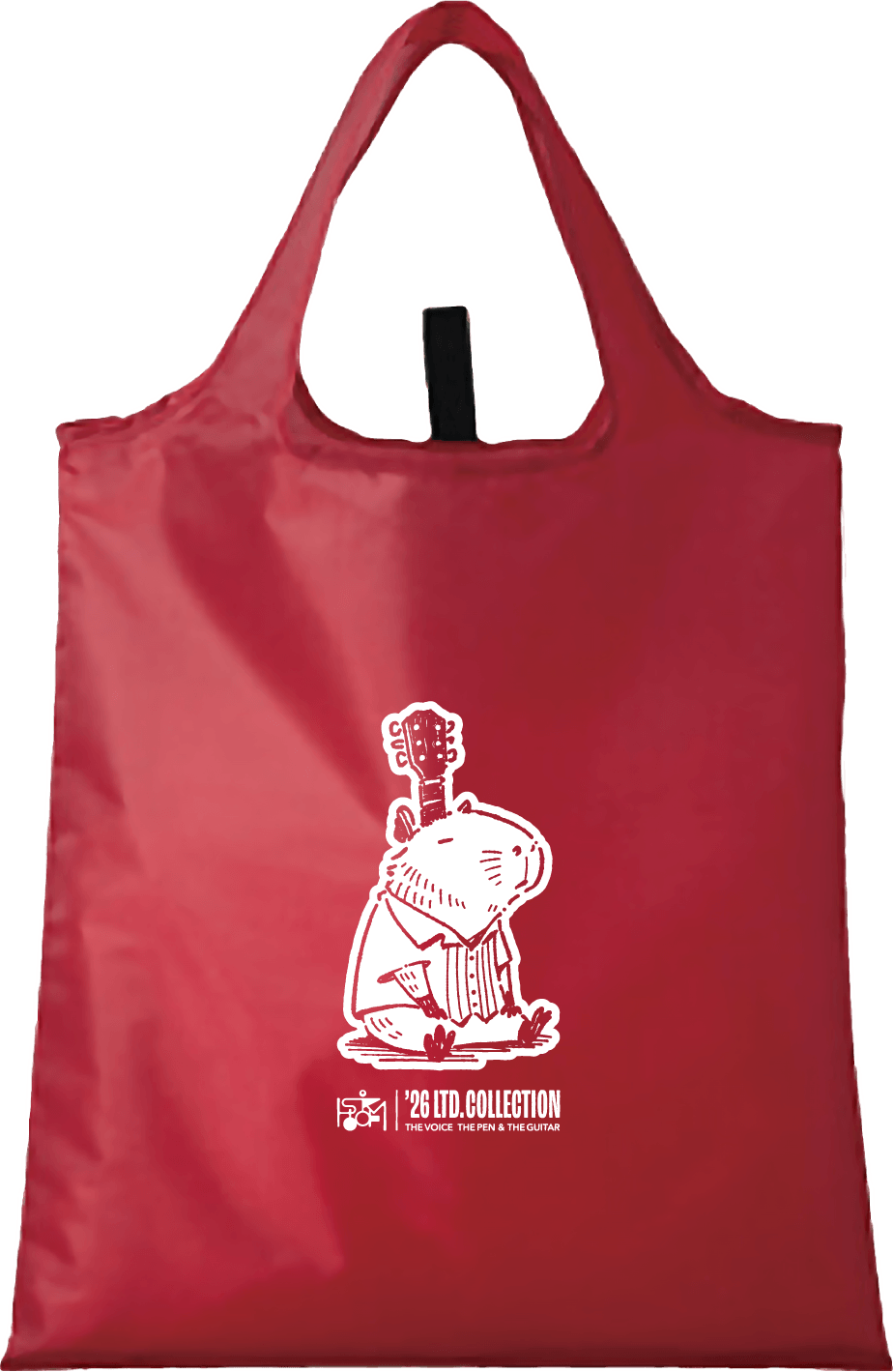 2026年NEWグッズ!カピバラエコバッグが登場です! 赤とこ紺色の2色展開。 折りたためてゴム止めできるエコバッグ。 大きめサイズで(約W380×H410 収納時/約W130×H60×D15)カバンにポンと入れておけます! ダイコンとかも入っちゃう!なんといっても"アコギのネックが頭から生えちゃったカピバラちゃん"がかわいい!